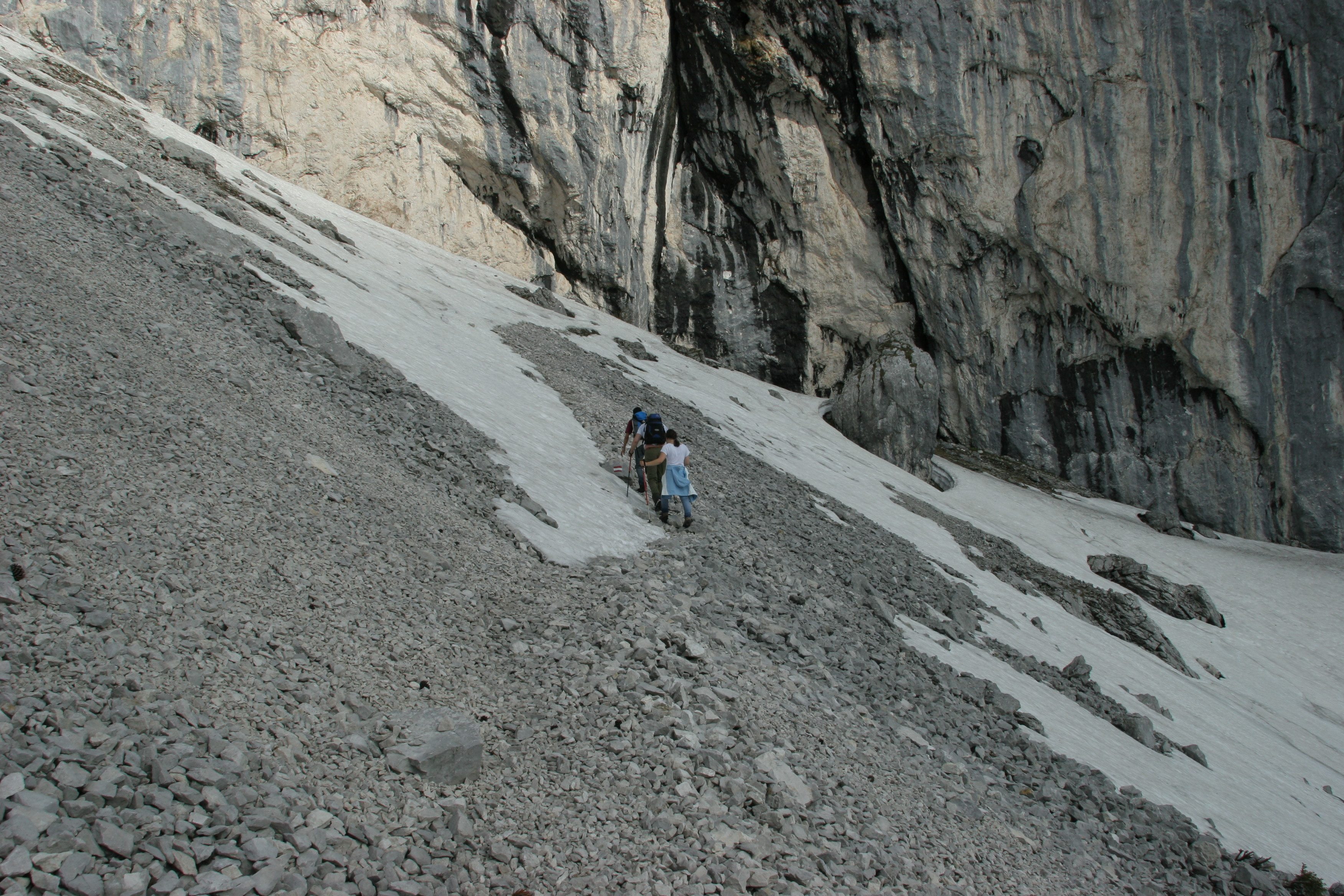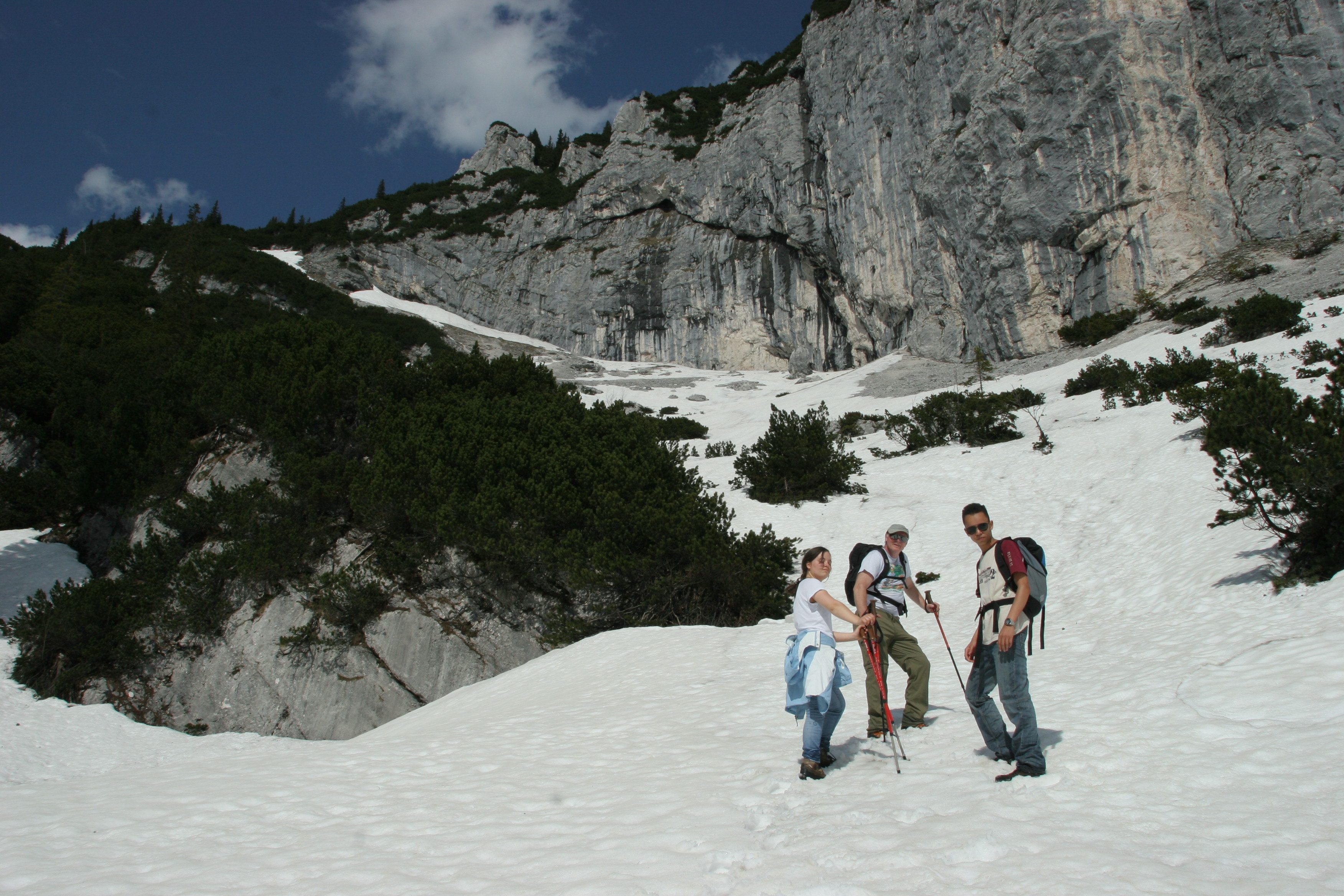 Von der Hütte aus ging’s Richtung Pyramidenspitze, jedoch lag noch zu viel Schnee, als dass wir bis ganz hinauf kamen. Wir drehten auf halber Strecke um und begnügten uns mit einem Vorgipfel, von dem man „Schuh-fahren“ konnte bis zum Wanderweg, also mit den Bergschuhen abi-rutschen.
