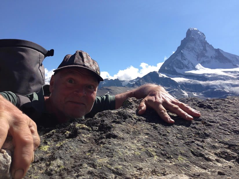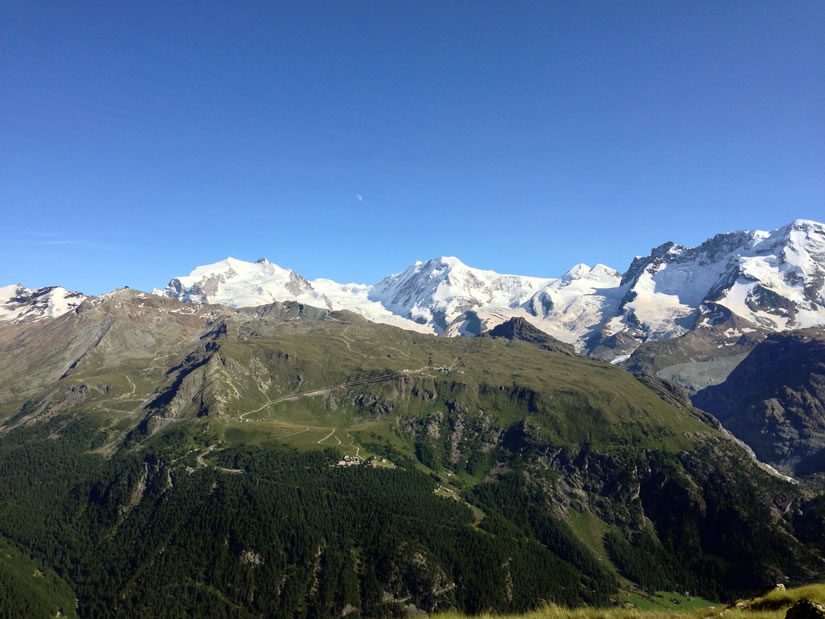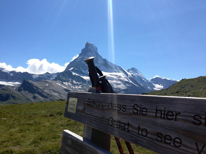 Kaum ein Berg ist so charakteristisch wie das Matterhorn. Obwohl, er heißt genau so gut: Monte Cervino. Denn auf dem Gipfel ist die Grenze zu Italien. Der Höhenweg über Zermatt erlaubt grandiose Blicke auf den markanten Gebirgsstock. Aus rein technischen Gründen versagten wir uns eine Besteigung desselben, aber die unten abgebildete Bank bestiegen wir mit Leichtigkeit! Von dort aus hat man auch einen unvergleichlichen Blick auf die gegenüberliegenden Gletscher und kann ihnen genüßlich beim Abschmelzen zuschauen. Bis 2050, sagt man, ist die Schweiz eisfrei. Tröstlich, denn nach meiner Beobachtung schmilzt Erdbeereis wesentlich früher; und bestimmt finden die Schweizer noch lukrative Möglichkeiten, ihr letztes Eis gewinnbringend zu veräußern. „Wär chat’s erfunden?“