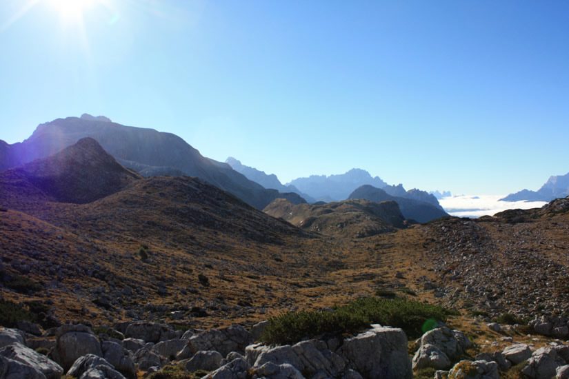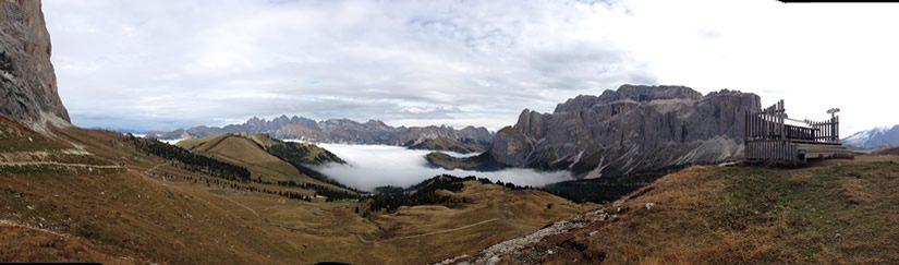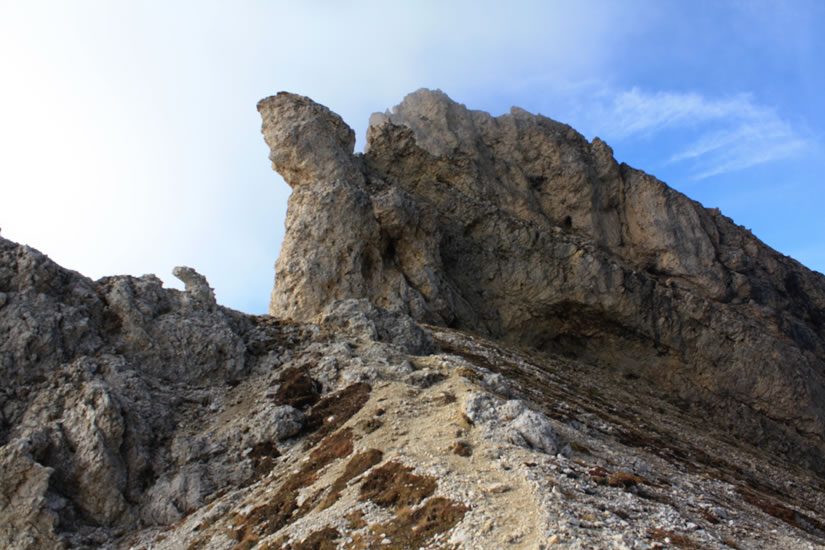 Nach ruhiger Nacht befanden wir uns zwischen zwei Wolkenschichten. Tagsüber umrundeten wir den Lang- und Plattkofel. Eine recht abwechlsungsreiche Tour!