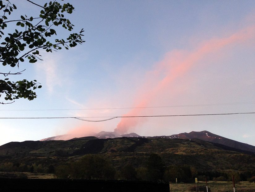 Was hier als rosa Wolke erscheint ist Rauch, denn es gab noch niemanden, der dem alten Riesen das Rauchen abgewöhnt hätte. Weithin hörbar ist auch das Fauchen, wenn das Dampf-Gas-Gemisch entweicht. Meine weibliche ‚Begleitung befürchtete schon das Schlimmste, weil es so arg grimmig klingt. Man ist aber generell froh darum, denn wenn er stumm ist, dann würde er Druck aufbauen. Und wenn der sich plötzlich entlädt, dann rumpelt es gewaltig und dann gehen die flüssigen Lavaströme schon mal bis ans Meer, und heiße Asche überzieht die Landschaft im Umkreis von 40-50 Kilometern. Das bedeutet Evakuierungen und andere Unbill.